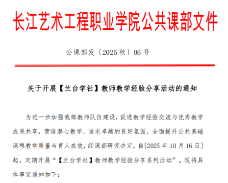 为强化学院教师队伍建设,推动教学经验交流与优秀教学成果共享,自10月16日起,由公共基础课部牵头发起,面向全体教师每周定期举办“兰台学社”教学经验分享活动。截至11月5日,“兰台学社”已成功举办四期主题活动。每期活动均引起全院师生的广泛关注与热烈讨论,营造了浓厚的教学研讨氛围。